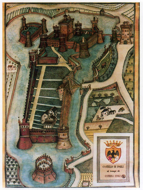 1496年、ジローラモ・リアリオの未亡人で息子オッタヴィアーノ・リアリオの摂政カテリーナ・スフォルツァは、建築資材と既成の建築構造を入手するためにシニョーリア宮殿を破壊し、14世紀の砦の跡に居住のためのパラディーソ宮殿と壁で囲った庭を建設。この庭で彼女は野菜や花や薬草を育てていた。さらに、南の境界に沿って、動物園と果樹園を兼ねた庭を設けた。