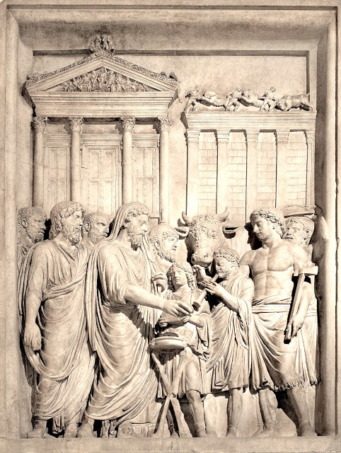カンピドリオのユピテル神殿の前で奉納祭を行う皇帝 L'imperatore celebra un sacrificio davanti al tempio di Giove in Campidoglio
