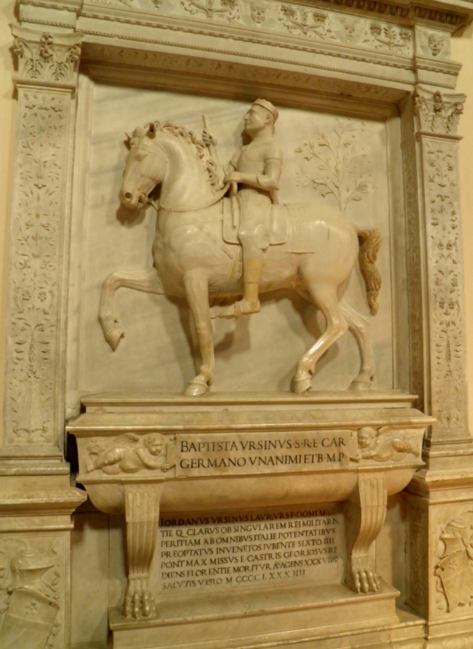通例のように被葬者像が石棺の上に横たわる姿ではなく、馬上で表されていることが、この作品における特異な点である。ラツィオ地方には、これに類する例は他に2つしか存在しない。1つは1466年に制作されたサンタ・マリア・ノヴァ聖堂にある「アントーニオ・リドの墓」、もう1つは1482年にカラブリア公アルフォンソ2世・ダラゴーナとの戦いでジョルダーノ・オルシーニの指揮官であった「ロベルト・マラテスタ騎馬像」で、1483~1484年にサン・ピエトロ大聖堂に制作されたものである。事実、僅か2年の間にこの世を去ったのは、1482年のロベルト・マラテスタ、そして1484年の教皇シクストゥス4世とジョルダーノ・オルシーニであった。