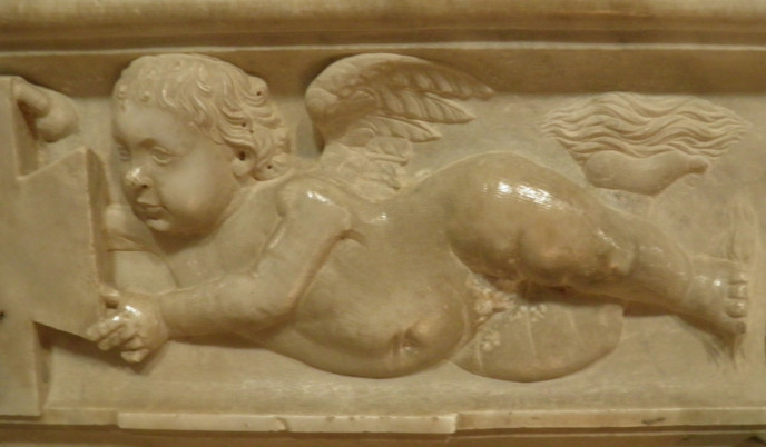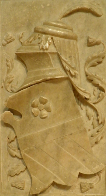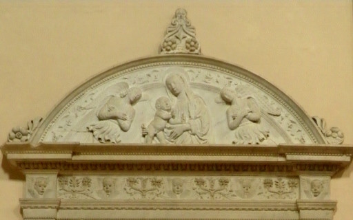 1659年に教会の中から移設されて右側外壁にある。マラテスタ家とシジスモンド・マラテスタの紋章が花綱から垂れている。