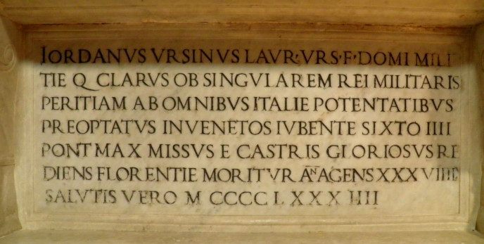 ロレンツォ・オルシーニが子息ジョルダーノ・オルシーニ、軍務において並外れて優れ、軍事の卓越した技量によりイタリアの全有力者から最も望まれし者となる。教皇シクストゥス4世の命によりヴェネツィアへ派遣され、戦陣より栄光をもって帰還する途上、フィレンツェにて没す。享年38歳。没年1484年。